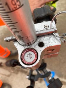 At the following point we align the SX10 to clock onto the prism (picture) at a height of 0.100m. Here the SX10 takes two measurements, turning 180 degrees for the second to reduce error. This method is called traversing (going back and forth taking measurements).