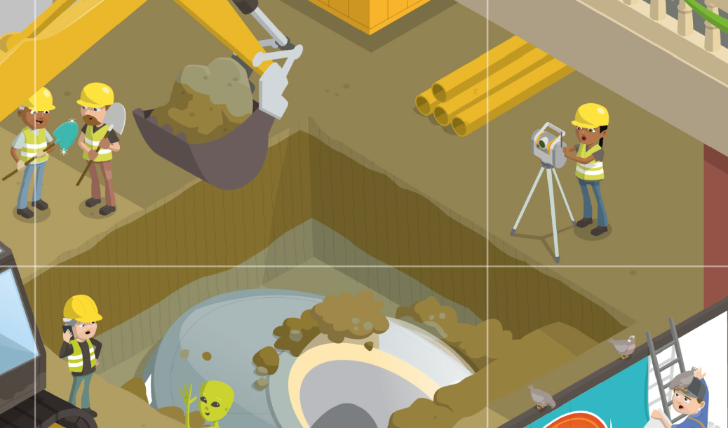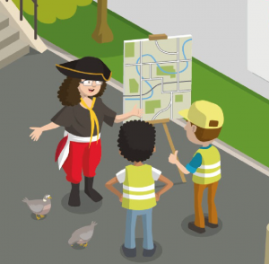 Captain Alice is in grid reference 2E. She’s a real-life cartographer – someone who makes maps! Here, she’s showing her map of the city to two surveyors who have got lost, and helping them get back to their job site.