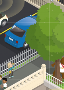 The Murphy Survey surveyors are in grids 4I and 5I. They’re surveying the road to check that the new tarmac is level, so cars and bicycles can drive along it safely and so that it won’t suffer uneven wear (which means it would need to be repaired more often, which is expensive and means the road has to be shut for a while). If the tarmac isn’t evenly spread, there will be bumps that could send cyclists flying as well as dips which will collect water. Plus, if the surveyor spots that the road surface is even a tiny bit higher than it should be, it means the workmen are laying down too much tarmac and so they’re wasting money.